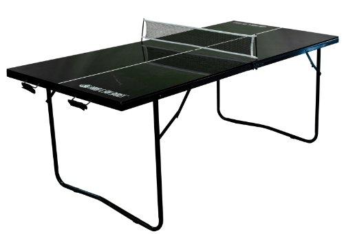 Love table tennis but don't have room in your basement or garage for a regulation table? Turn to this mid-sized table from Park & Sun, which requires less space but still offers all the fun, excitement, and competitiveness of full-sized table tennis. The mid-sized table measures 81 by 36 by 28 inches (W x L x H) and features a 1/2-inch thick MDF melamine tabletop with a cool black finish. The surface plays smooth and offers plenty of bounce, ensuring nonstop game action. The table also includes folding legs for easy storage, along with a black mesh net with white tape. And should you want to move the table from the basement to the patio, simply grab the built-in end carrying handles. The mid-sized table comes with two basic wood paddles and two table tennis balls to get you started.